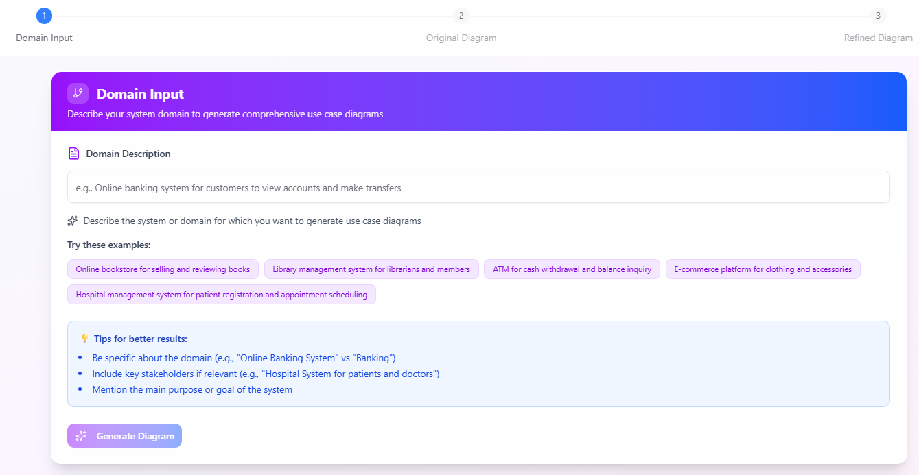 • In the tool’s input field, provide a clear, concise description of the system domain. The video uses “booking system for a garage” as an example. This could include key functionalities like scheduling appointments, managing payments, or handling cancellations.