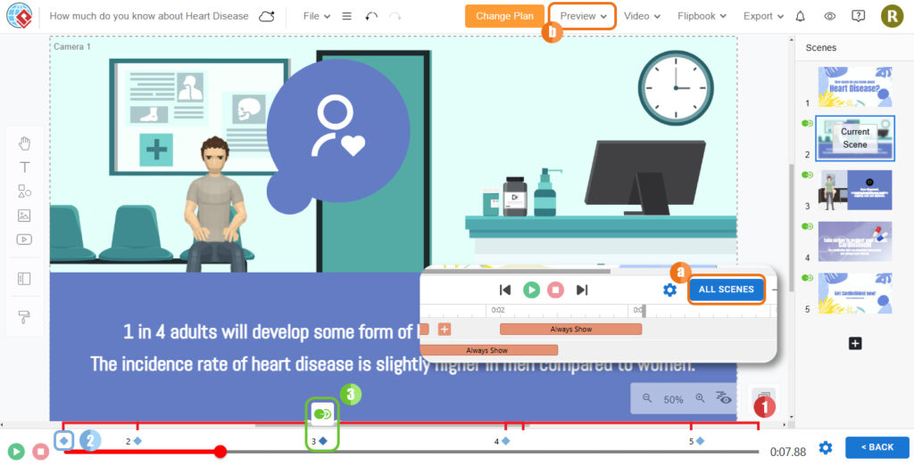 Visual Paradigm Online offers the flexibility to create animations across multiple scenes, and the “All Scene View” is an essential feature for efficiently previewing and managing these scenes. This view allows you to see how all scenes come together in the timeline, providing a comprehensive overview of your animation. In this tutorial, we’ll explore how to use this feature to enhance your editing and previewing process.